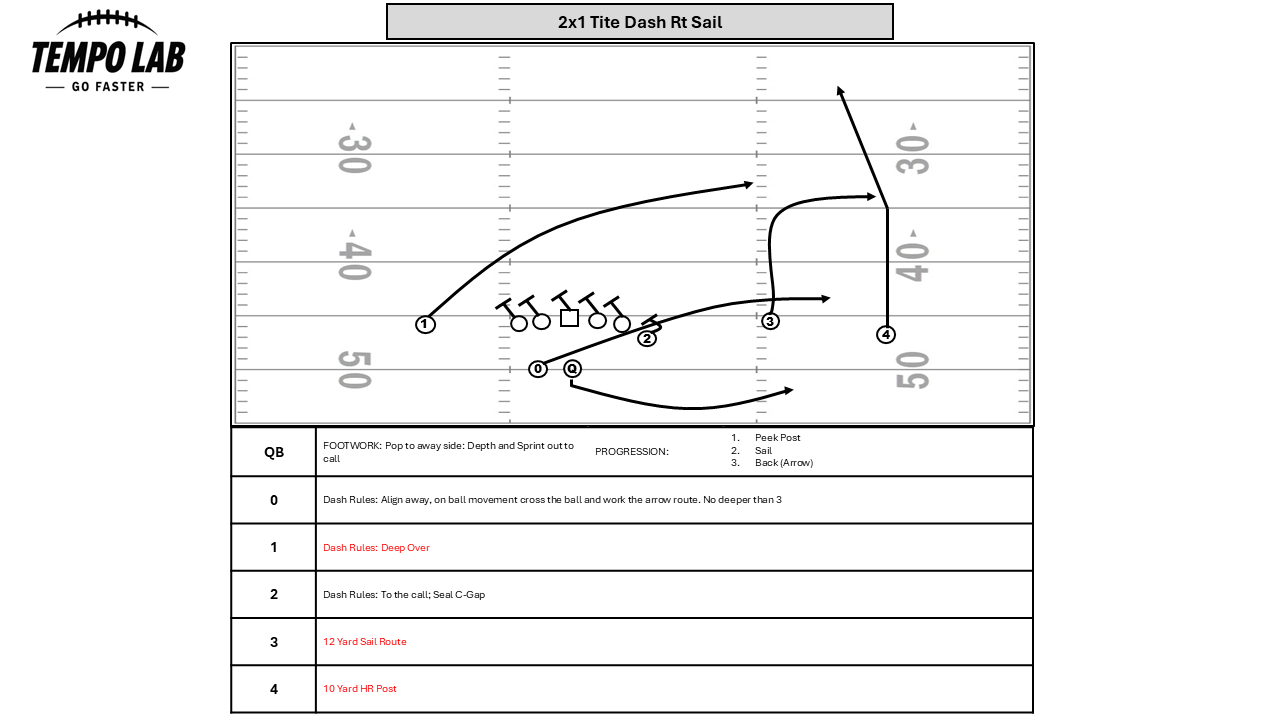 Below I am going to show some of my favorite designs from over the past few years. Many of them include the “Dash” design which has really caught fire over the past few seasons. I hope this sparks your ideas and can help provide a more efficient passing game. Not only can you get creative with this style of play, but it can be a safety net you call when you feel stuck as a play caller. I know a lot of coaches that use the sprint out during their 2 minute drill and have had great success! No matter how you plan on implementing it, I think it really is worth at least looking into.